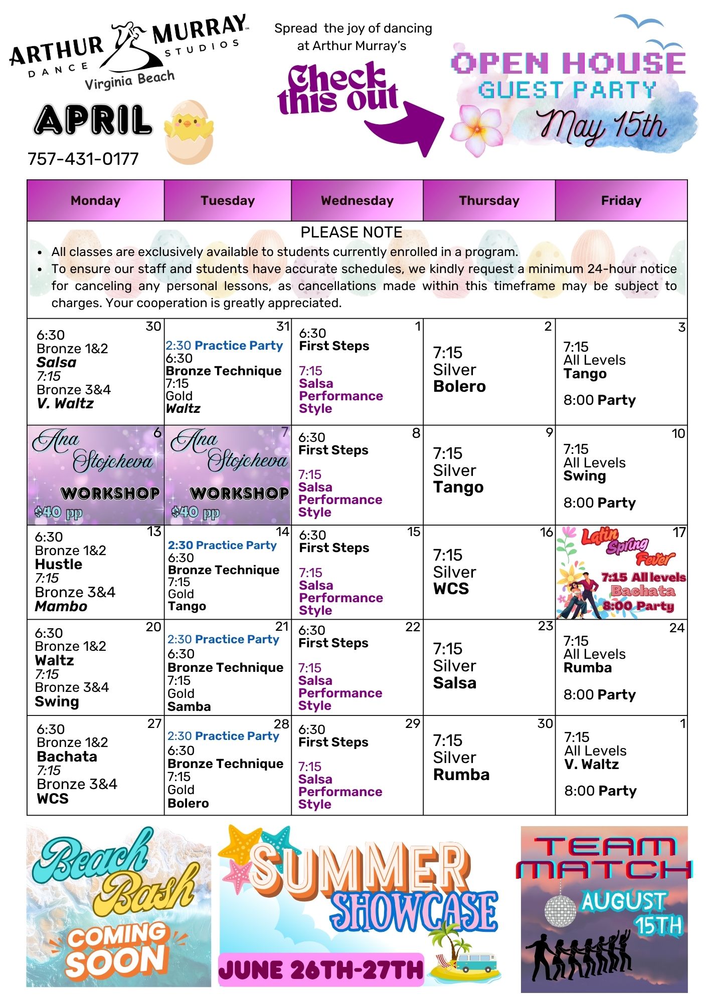 MONTHLY SCHEDULE FOR BALLROOM & LATIN CLASSES, PARTIES, COACHINGS, & EVENTS AT ARTHUR MURRAY IN VA BEACHSTUDIO CALENDAR Ready to dance? Join the FUN! Click to Enlarge or Download GET STARTED PRIVATE LESSONS GROUP CLASSES